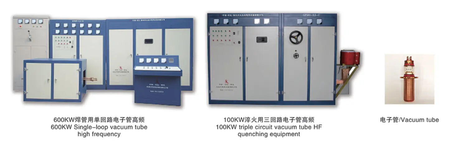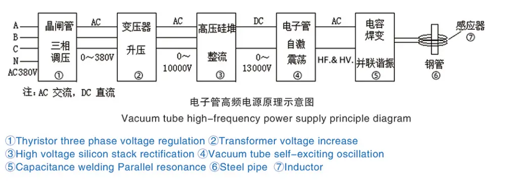 通常の産業用交流(中国では三相4線380V/50HZ)は、サイリスタ交流電圧調整器を介して0〜380Vの範囲で調整可能な交流(周波数は不変)に変換され、変圧器で10000V近くの高電圧(周波数は不変)に昇圧され、高電圧整流回路で数万の高電圧DCに整流され、その後真空管でHFおよびHVに発振されます。電流を励起し、LC並列共振により発振電流を増幅し、降圧後、鋼管などのワーク加熱用インダクタに供給します。